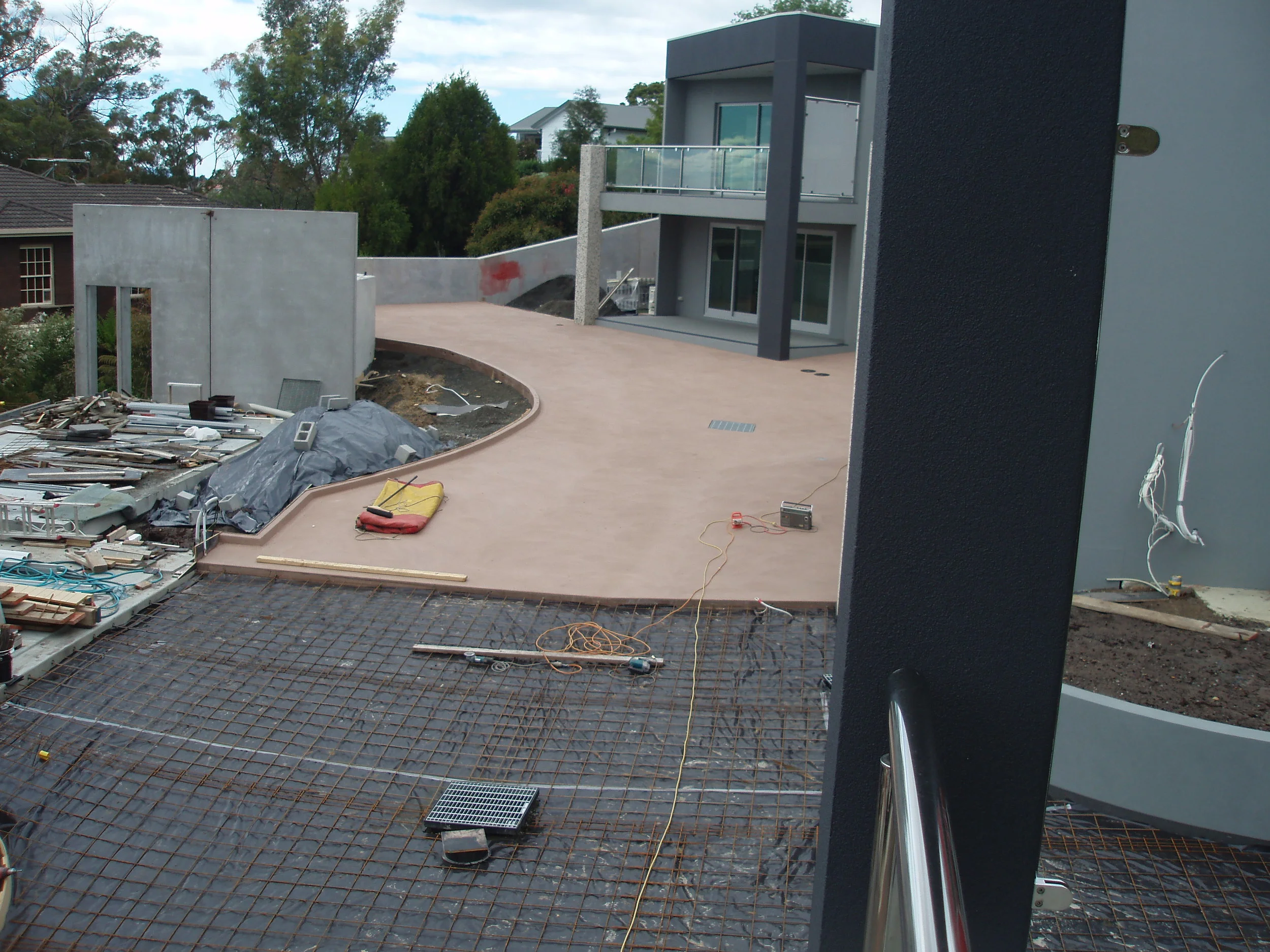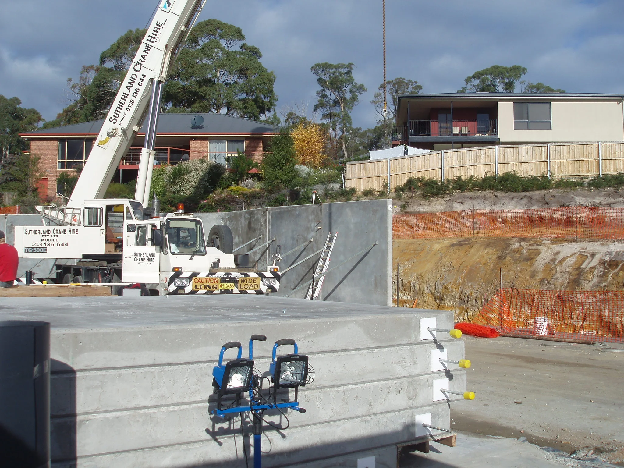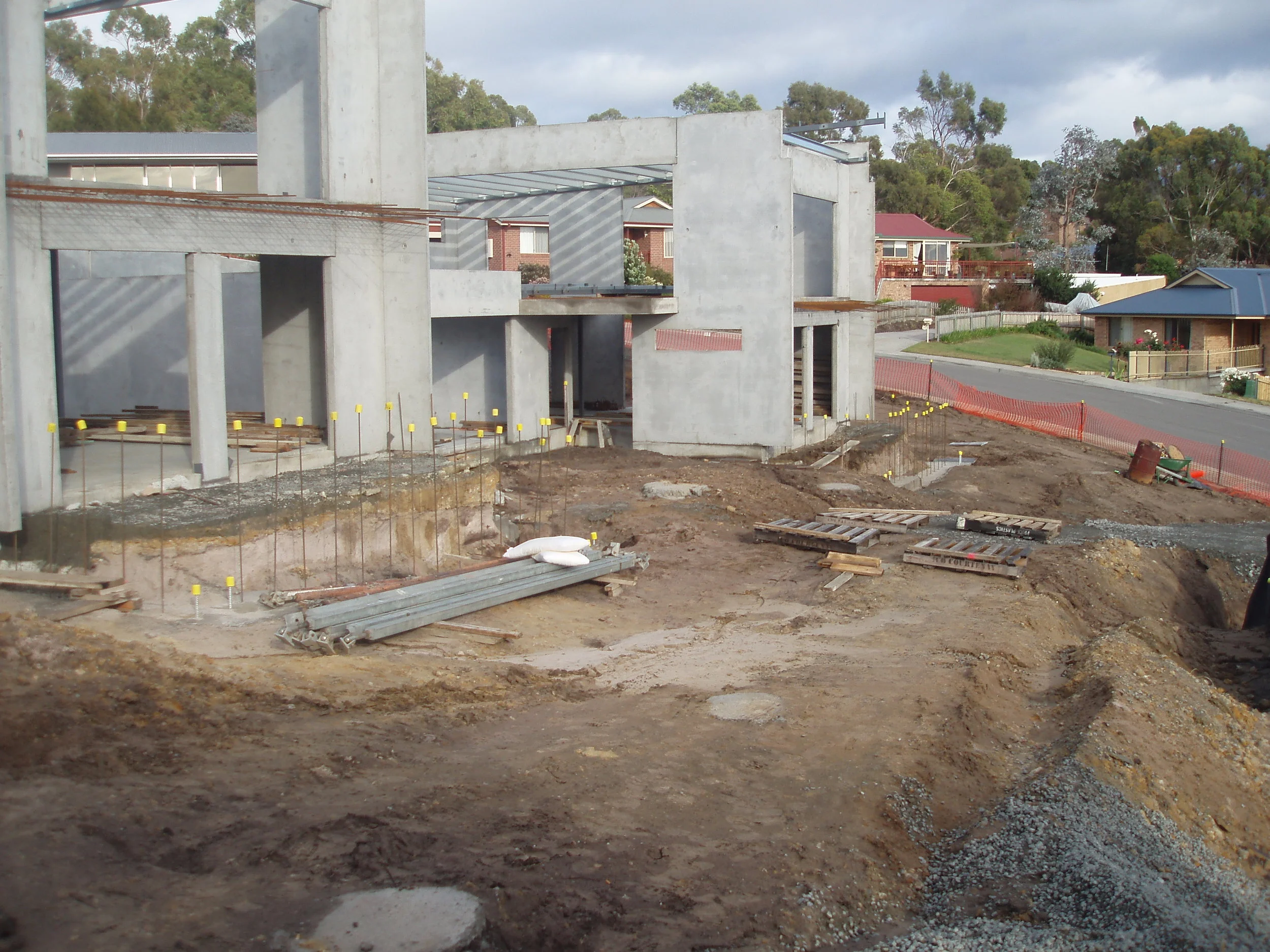 This project was situated on a sloped 2300m2 site with a tennis court in the middle. The tennis court pre-cast panel retaining walls were constructed on site, footings were excavated, panels erected and then the site was excavated to the required levels. Townhouse panels were fabricated off site with some components made on site.